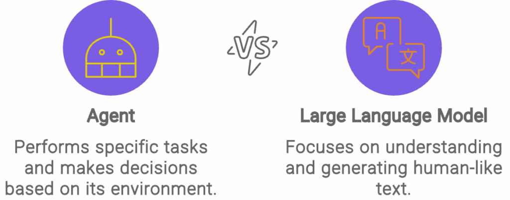 Let us debunk a common misunderstanding regarding the difference between agents and large language models (LLMs). Both belong to the family of artificial intelligence, yet they possess distinct capabilities.