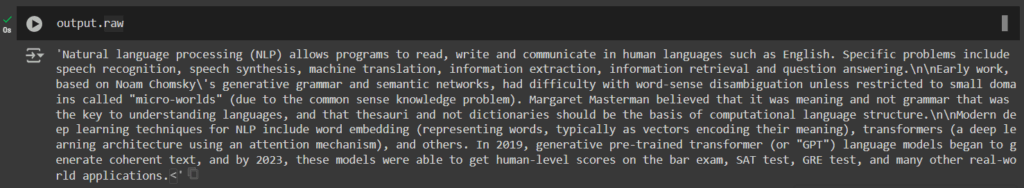 We create a data analyst agent with the role of an educator. This agent’s task is to answer the question “What is Natural Language Processing?” based on the text we searched in the file.